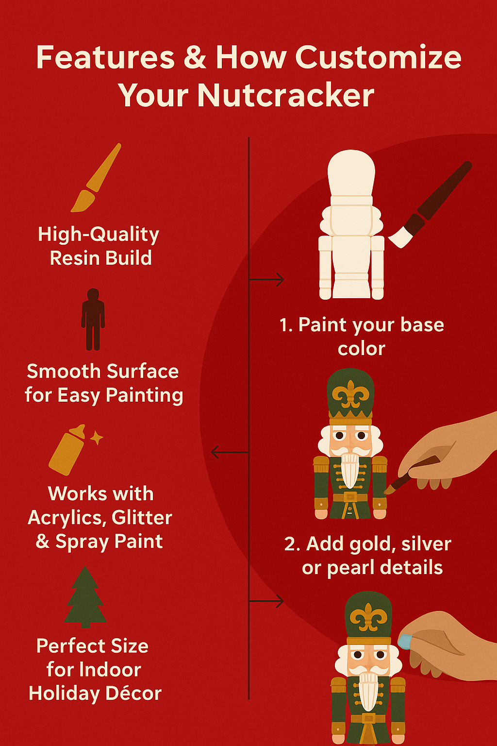 Our DIY Nutcracker features a smooth, high-quality resin surface that’s perfect for painting, glittering, and decorating. Personalize it in minutes — just paint, detail, and display. A fun, easy, and festive way to add a unique touch to your holiday décor!